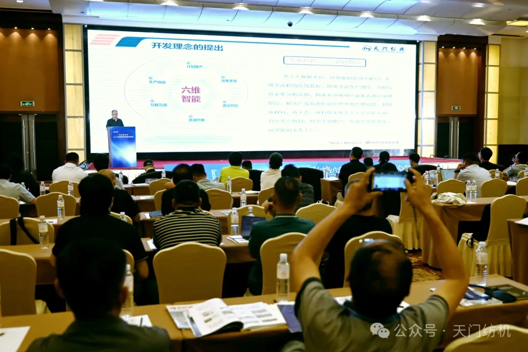 在技術交流環(huán)節(jié)中,天門紡機品控總監(jiān)樊早斌作了題為《六維智能開創(chuàng)并條產(chǎn)線聯(lián)動新時代》的主旨報告。他深入闡述了產(chǎn)線聯(lián)動的理念、研發(fā)背景和思路,詳實介紹了基于六維智能的并條創(chuàng)新技術以及產(chǎn)線聯(lián)動的實踐應用與開發(fā)進程。他強調(diào),“六維智能”開發(fā)理念的提出是基于大數(shù)據(jù)平臺,其創(chuàng)新點就是以智能制造為突破口,實現(xiàn)全流程的在線監(jiān)控、快速靈活生產(chǎn)調(diào)度、實時信息采集分析反饋,快速有效地對產(chǎn)品狀態(tài)進行實時跟蹤,解決產(chǎn)品追溯控制管理中的關鍵問題;利用新材料、新工藝、新科技實現(xiàn)上下工序互聯(lián)互通,有序生產(chǎn)協(xié)同,科學計劃排產(chǎn),全面實現(xiàn)低成本、高智能的無人工廠。