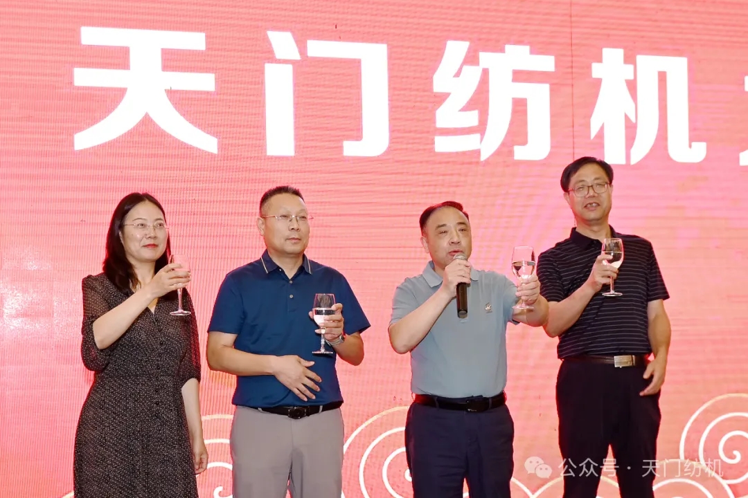 陜西省紡織科學研究院有限公司黨委書記、總經(jīng)理徐遠志,天門紡機總經(jīng)理焦倫進,天門紡機副總經(jīng)理肖少華,《棉紡織技術》期刊社副總經(jīng)理冉軍麗答謝晚宴共同祝酒