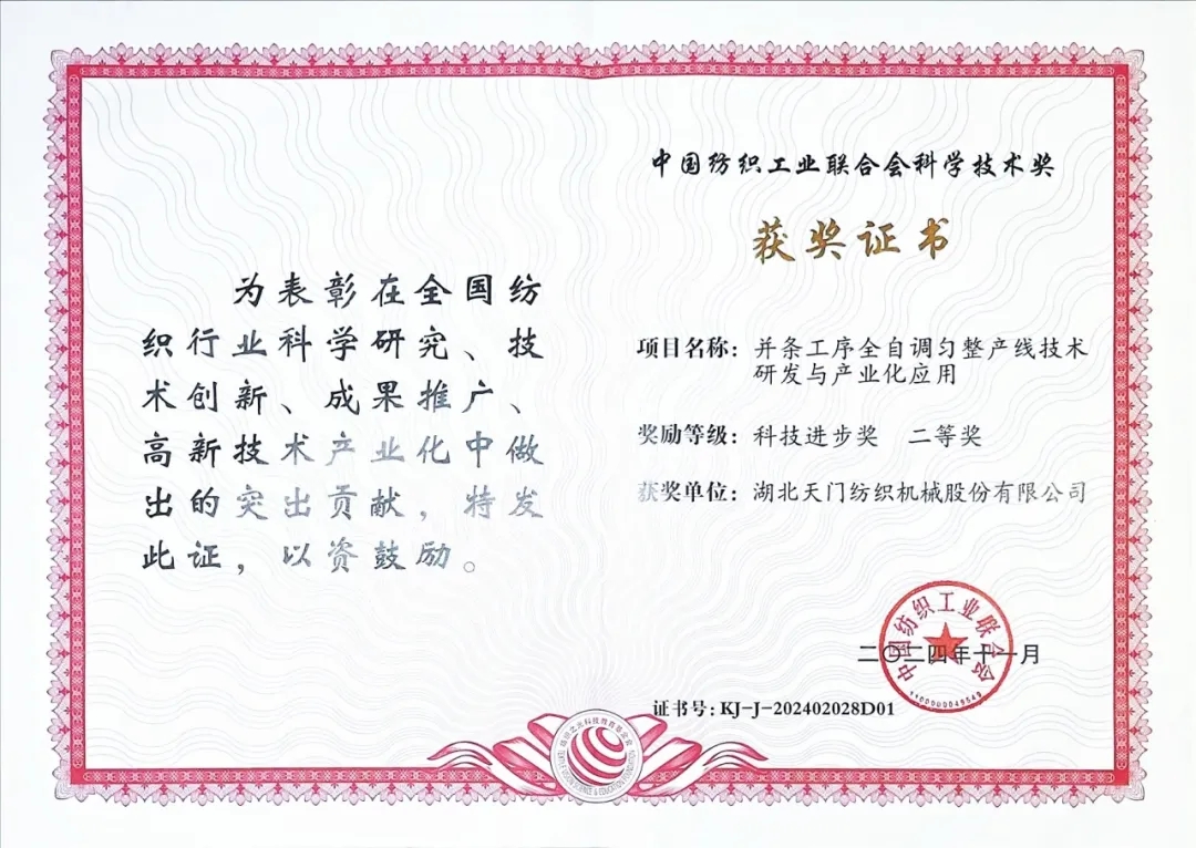 2024年11月12日,在北京人民大會堂召開的2024年度中國紡織工業(yè)聯(lián)合會科學(xué)技術(shù)獎勵(lì)大會傳來喜訊,由天門紡機(jī)主導(dǎo),武漢紡織大學(xué)、安徽華茂紡織股份有限公司、武漢銀橋南海光電有限公司等單位合作開發(fā)的“并條工序全自調(diào)勻整產(chǎn)線技術(shù)研發(fā)與產(chǎn)業(yè)化應(yīng)用項(xiàng)目”獲得2024年“中國紡織工業(yè)聯(lián)合會科學(xué)技術(shù)獎”科技進(jìn)步二等獎。