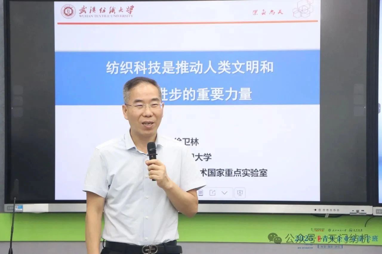 第一課由中國工程院院士、武漢紡織大學(xué)黨委書記徐衛(wèi)林主講,主題為《紡織科技是推動人類文明和社會進(jìn)步的力量》。他從紡織起源開始娓娓道來,貫通文化、品牌與時尚,深入剖析紡織科技的發(fā)展脈絡(luò)與未來趨勢,為學(xué)員們帶來前瞻視野。